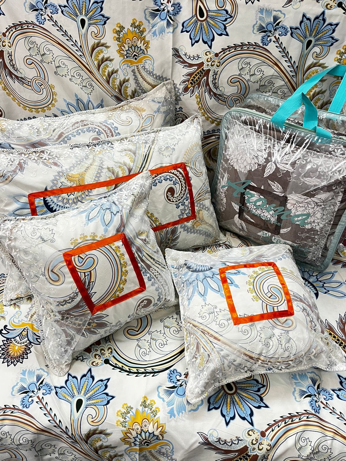 Set with Pillow and Cushion Covers, 90″ Set, 5 Pieces, White and Orange, Stain-Resistant Cotton
