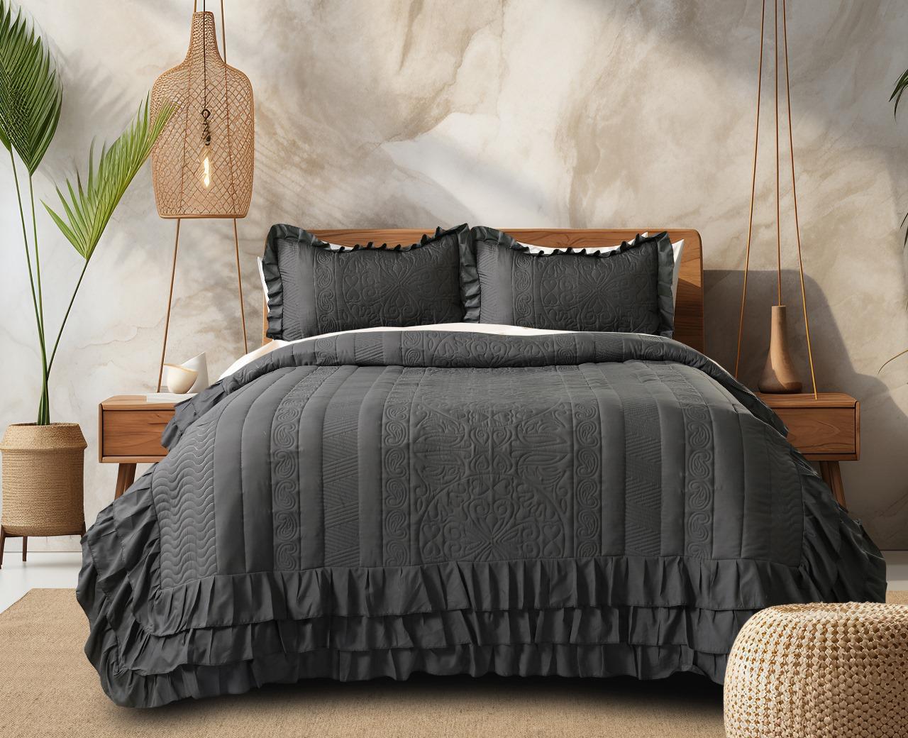 Royal Quilted Bedcover with Frill Detailing 3Pc Set | Black